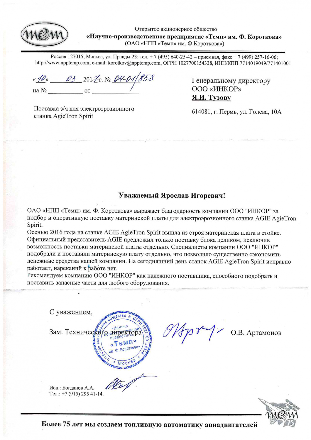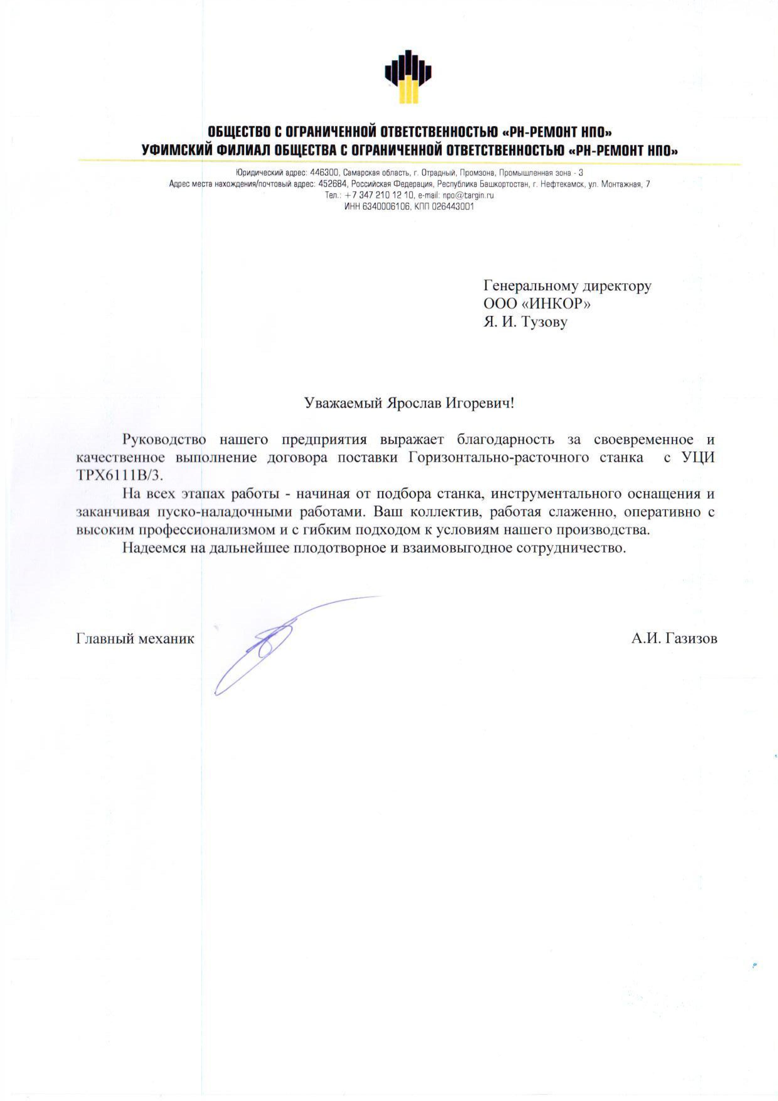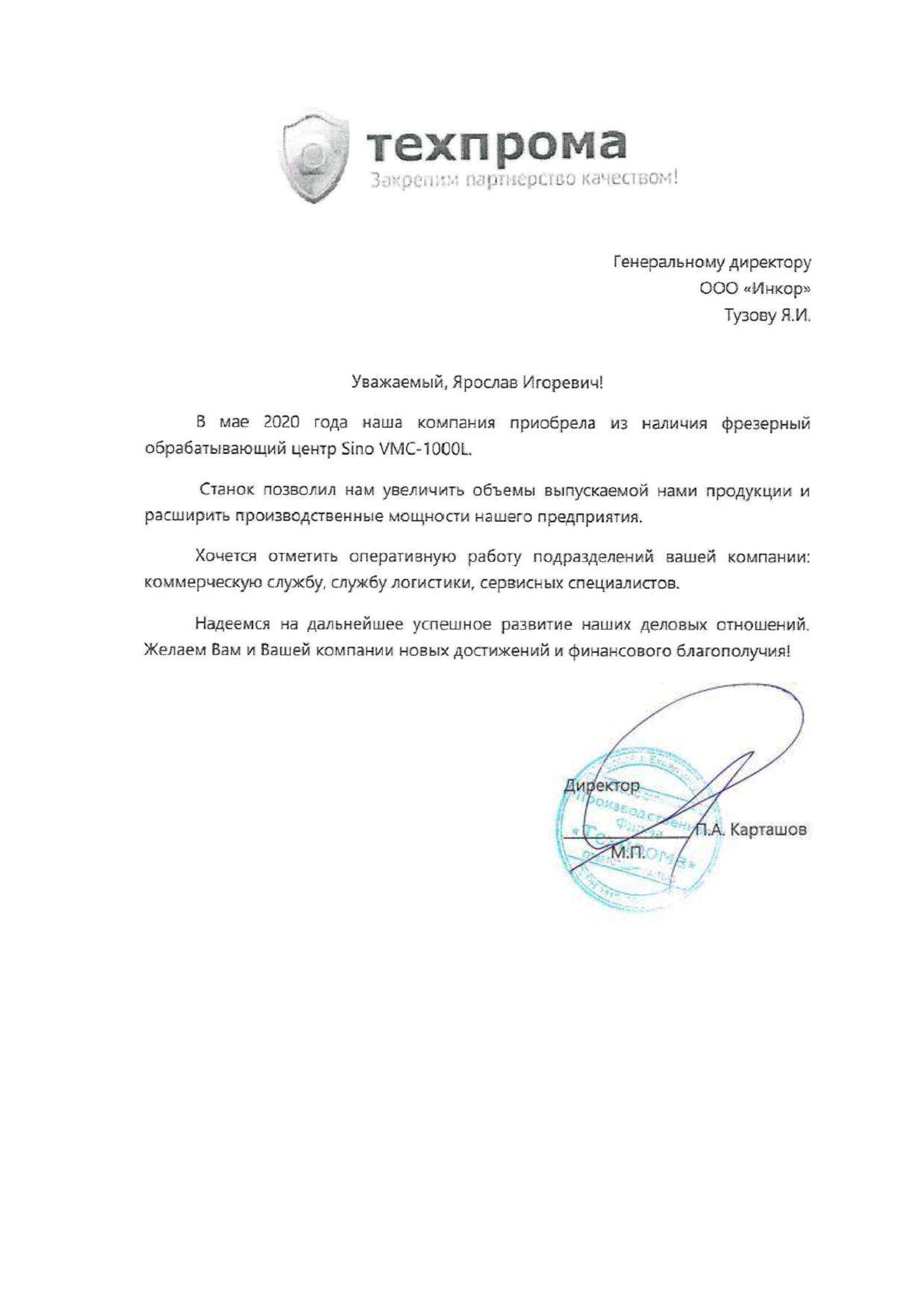 Мы искренне благодарим Вас и вверенный Вам коллектив за качественную и оптативную техническую поддержку со стороны ваших специалистов. Благодаря их высочайшей квалификации и профессионализму были решены в минимальные сроки абсолютно все поставленные задачи связанные с обеспечением работоспособности нашего оборудования с ЧПУ.