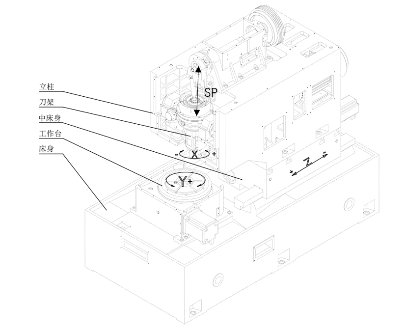 YK5115А представляет собой четырех-осевой станок с ЧПУ. Оси станка: возвратно-поступательные движения инструмента (ось SP), вращение шпинделя долбяка (ось X), вращение рабочего стола (ось Y) и радиальную подачу рабочего стола (ось Z).